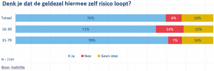 Zijn geldezels strafbaar? 16% van de totale bevolking heeft er geen idee van. 10% is ervan overtuigd dat er geen strafbare feiten gepleegd worden. Ook hier is het verontrustend dat 14% van de jongeren denkt dat geldezels geen risico’s lopen.