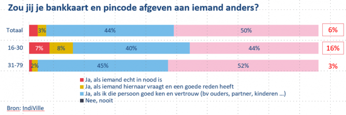 Uit een onderzoek van Febelfin in samenwerking met onderzoeksbureau IndiVille blijkt dat vooral jongeren heel vatbaar zijn om geldezel te worden. 16% zou het overwegen om hun bankkaart en pincode te geven in ruil voor geld.
