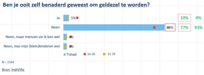 In hetzelfde onderzoek geeft 5% van de bevolking aan ooit benaderd te zijn met de vraag om geldezel te worden (in 2021: 3%). Nog eens 6% kent mensen die benaderd zijn.