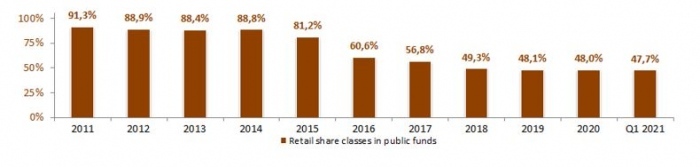 BEAMA definieert retail aandelenklassen als zijnde aandelenklassen die mogen aangeboden worden aan particulieren, waarbij de minimale (initiële) inleg niet meer bedraagt dan 100.000 EUR en waarbij er geen bijkomende voorwaarden worden opgelegd door de beheerder van het fonds. Tijdens de eerste jaarhelft van 2016 werden zodoende technische verfijningen in de statistieken van BEAMA doorgevoerd.