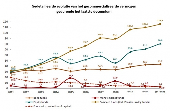 De categorie van de gemengde fondsen (inclusief de pensioenspaarfondsen) tekende een stijging van 6,0 miljard EUR, of 5,5 %, op tijdens het eerste kwartaal van 2021. Deze stijging is voor 3/4de toe te schrijven aan koerswinsten opgetekend door de onderliggende activa. Daarmee komt het gecommercialiseerde vermogen van de gemengde fondsen per eind maart 2021 uit op 115,6 miljard EUR, oftewel 10,0 miljard EUR boven hun niveau van eind 2019 (= pré-Covid-19).