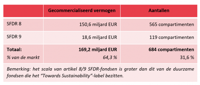 Bijna 2/3de van het in België verdeelde vermogen is, volgens de vermogensbeheerders, geklasseerd als zijnde een artikel 8 of een artikel 9 SFDR-fonds. Hierbij kan de belegger die geïnteresseerd is in duurzaamheid, kiezen uit 684 verschillende fondsen.