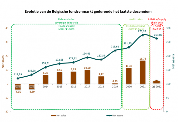 De Belgische fondsensector kende tijdens het eerste kwartaal van 2022 een daling van -4,5 % en dit door toedoen van koersverliezen die worden opgetekend in de onderliggende activa. Eind maart 2022 bedroeg het netto actief van de in België publiek verdeelde fondsen 263,1 miljard EUR.