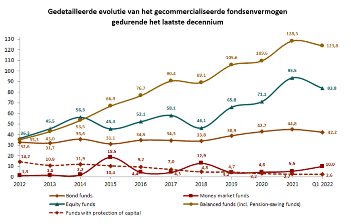 De categorie van de gemengde fondsen (inclusief de pensioenspaarfondsen) tekende een daling van 4,4 miljard EUR, of -3,4 %, op tijdens het eerste kwartaal van 2022. Deze daling is volledig toe te schrijven aan koersverliezen opgetekend door de onderliggende activa, aangezien er nog voor meer dan 2 miljard EUR aan netto inschrijvingen waren in de gemengde fondsen. Daarmee komt het gecommercialiseerde vermogen van de gemengde fondsen per eind maart 2022 uit op 123,8 miljard EUR.