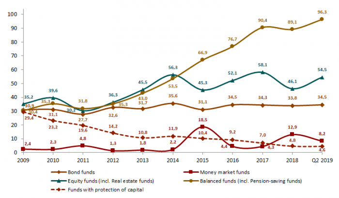 Het netto actief van de fondsen die hoofdzakelijk beleggen in vastrentende effecten noteerde een stijging van 4,7 % gedurende het tweede trimester van 2019. Het netto actief van de fondsen die hoofdzakelijk beleggen in niet-vastrentende effecten, zoals “balanced funds” en aandelenfondsen, steeg tijdens deze periode met 4,6 %.
