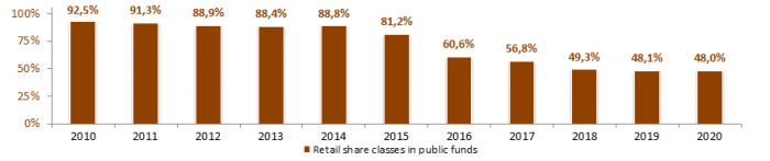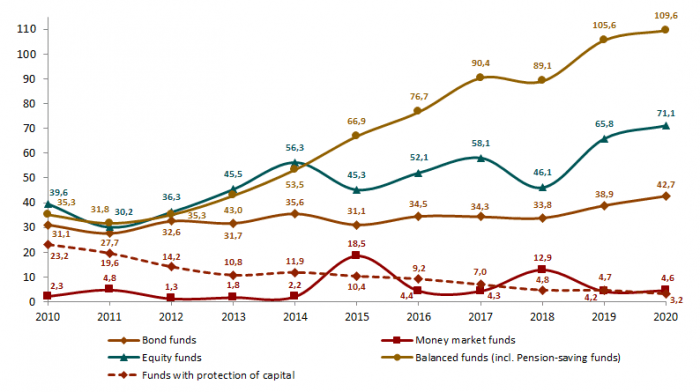 Hierbij is de verdere afbouw van de kapitaalbeschermde fondsen kenmerkend. Zij vormden eind 2020 de kleinste activa klasse.