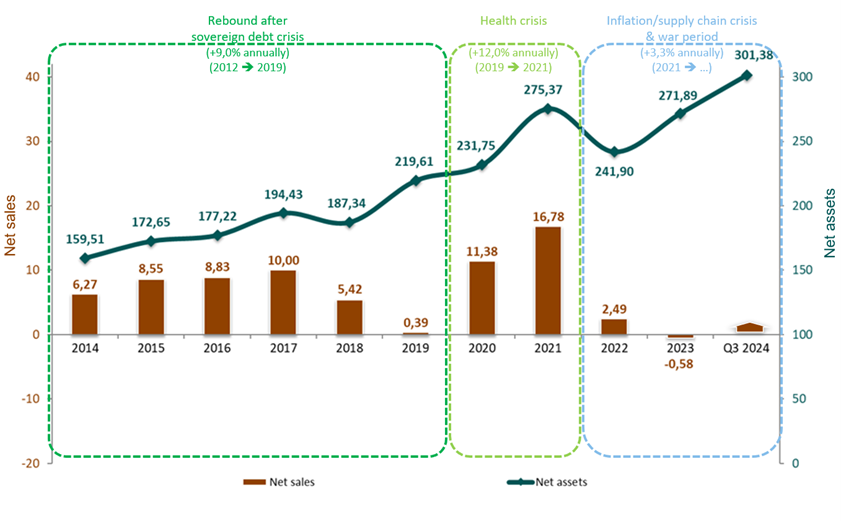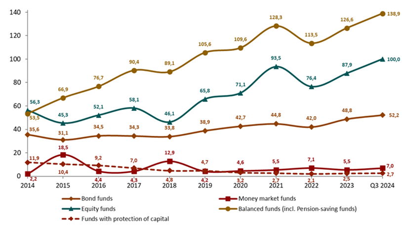 Over de eerste negen maanden van 2024 stegen de netto activa van de fondsen die overwegend beleggen in niet-vastrentende activa met +11,3 %, ofwel 24,6 miljard EUR.