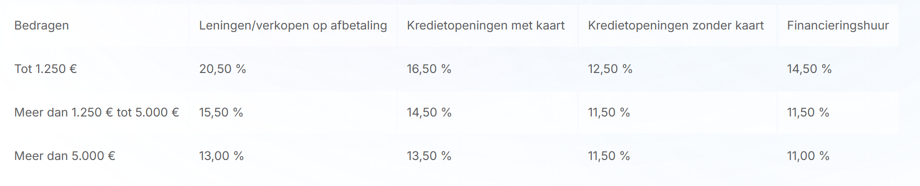 Het is nuttig om weten dat in de wet maximale kostenpercentages (JKP) zijn bepaald die de kredietgevers niet mogen overschrijden en waarboven het verboden is krediet te verstrekken. Die kostenpercentages worden periodiek herzien op basis van de evolutie van de geldmarkt.