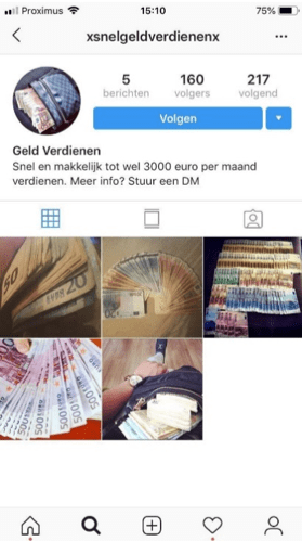 • Rapporteer accounts op sociale media die snel en gemakkelijk geld beloven aan het Meldpunt van de overheid voor misleiding, bedrog, fraude of oplichting.